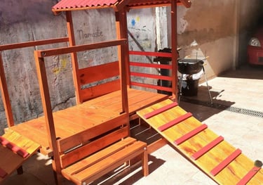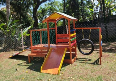 Um playground de madeira oferece uma estética natural, integra-se bem a ambientes externos, e é uma escolha sustentável quando a madeira é de origem certificada. Ele proporciona uma sensação tátil mais agradável e acolhedora para as crianças, além de ser durável e resistente, especialmente quando feita de madeiras tratadas. Trabalhomos com uma grande variedade de formatos ecombinações.